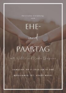 Ein Tag für Ehepaare, um innezuhalten, aufzutanken und neu in die Beziehung zu investieren. Der Ehe- und Paartag im Christus Zentrum Wesel bietet Paaren die Möglichkeit, sich bewusst Zeit füreinander zu nehmen – fern vom Alltag, nah am Herzen Gottes.