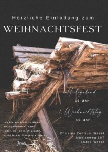 Beim Weihnachtsfest im Christus Zentrum Wesel wollen wir gemeinsam hören, was die Bibel über das Kommen des Messias sagt, und in Liedern, Gebet und Predigt ausdrücken, wie groß Gottes Liebe ist. Die Botschaft von Weihnachten ruft uns zur Dankbarkeit, aber auch zur Antwort: Jesus Christus ist der Retter, der gekommen ist, damit jeder, der an Ihn glaubt, nicht in der Finsternis bleibt, sondern das ewige Leben hat (Johannes 12,46).